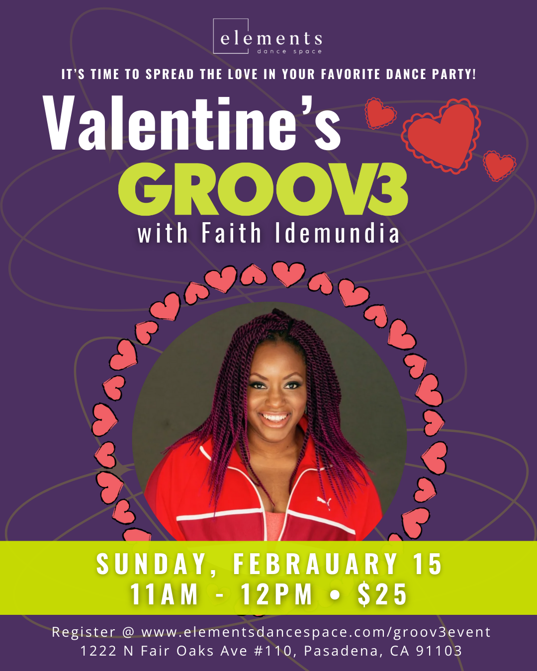 Join us for a SUPER FUN and GROOV3 Valentine’s dance party with, none other than the one and only, Faith Idemundia!